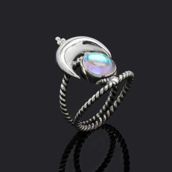 The natural rainbow moonstone gemstone in this ring radiates a mesmerizing blue flash, symbolizing inner peace, clarity, and emotional balance. Perfect for enhancing your yoga or meditation practice, this ring is more than just a beautiful accessory—it’s a spiritual ally.